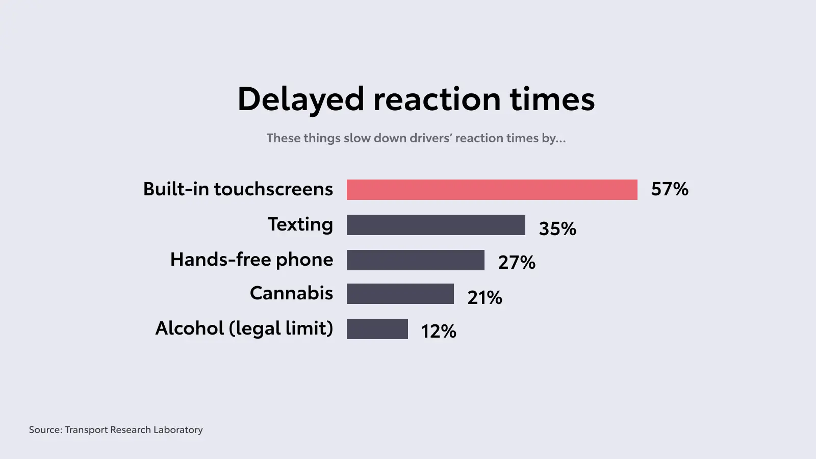 Whilst in many contexts the choice between visual or audio input is a matter of pure convenience, the stakes, when driving, are much higher: safety of the driver, passengers and others around them. According to Transport Research Laboratory, "drivers who use built-in touchscreen technology whilst driving are more distracted than if they were driving under the influence of alcohol, drugs or using a handheld phone to call or text.” with reaction times slowing down by shocking 57% (compared to 12% when drunk driving for example).